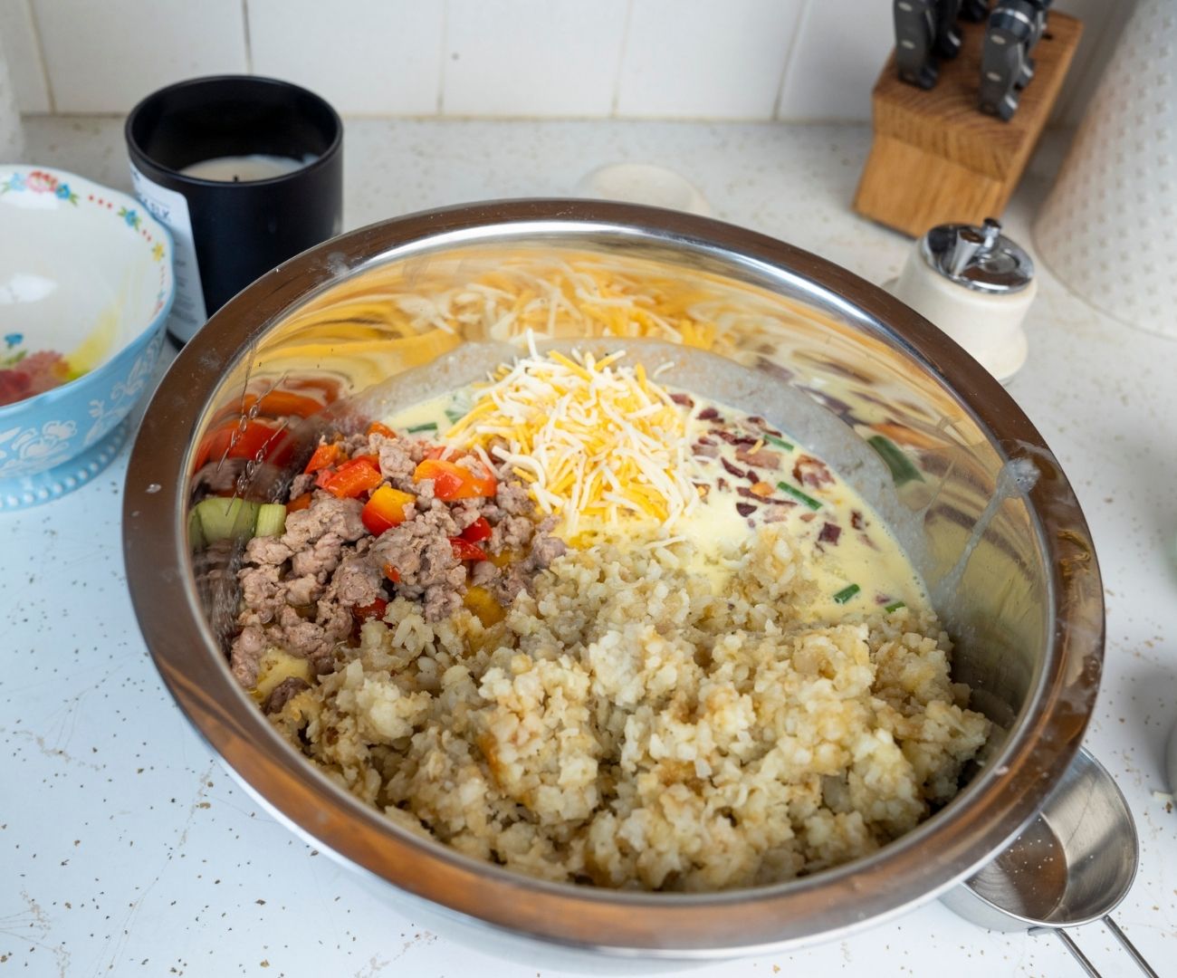 Mix your base. Whisk together eggs, a splash of milk or cream, and your favorite seasonings. Fold in shredded cheese and the cooked meat-veggie mixture.