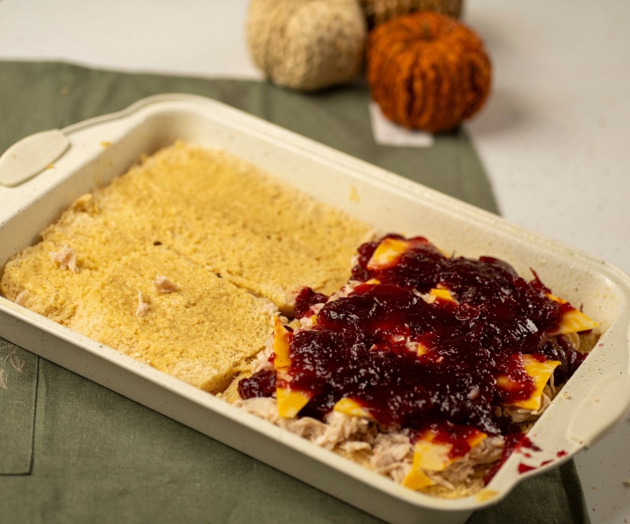 Layer on shredded turkey from The Farmer’s Turkey, slices of cheese, and spoonfuls of cranberry sauce. Place the top half of the rolls back on.