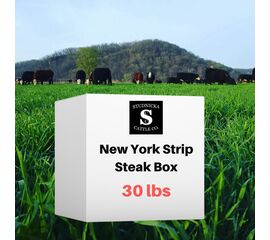 Grass-fed Beef New York Strip Steak Box (30 lbs. of Steaks)  Available:  Now Products and Approx. Weight/Quantity 30 lbs. 1" New York Strip Steaks (steak sizes and quantity varies, generally 40 steaks +/- 8)