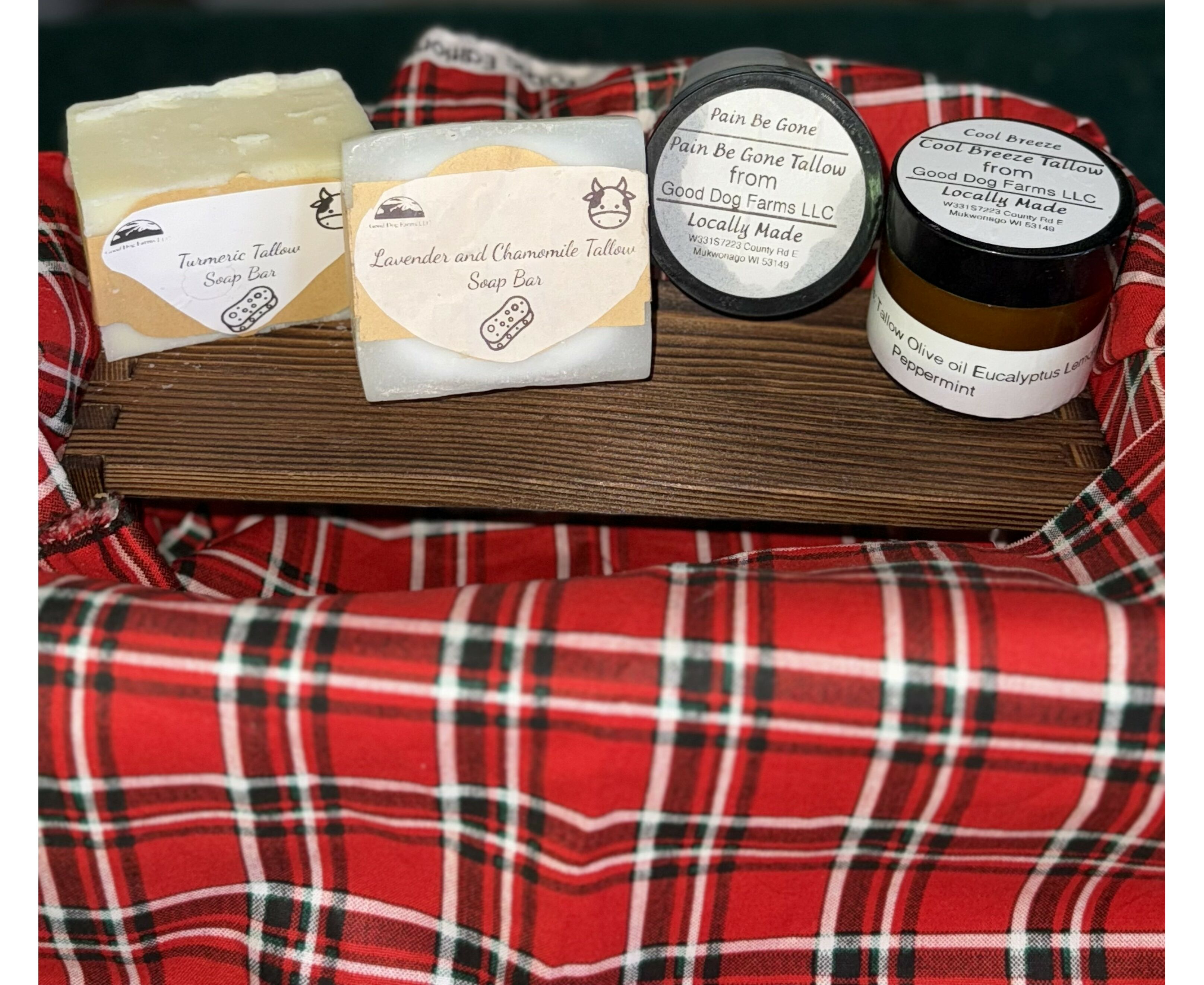 Looking for the perfect holiday gift for someone who needs a relaxing way to unwind? This box is for you! It contains our lavender and Chamomile tallow soap, along with our tumeric tallow soap, and our 2 oz Pain B Gone tallow lotion and 2 oz Cool Breeze tallow lotion.