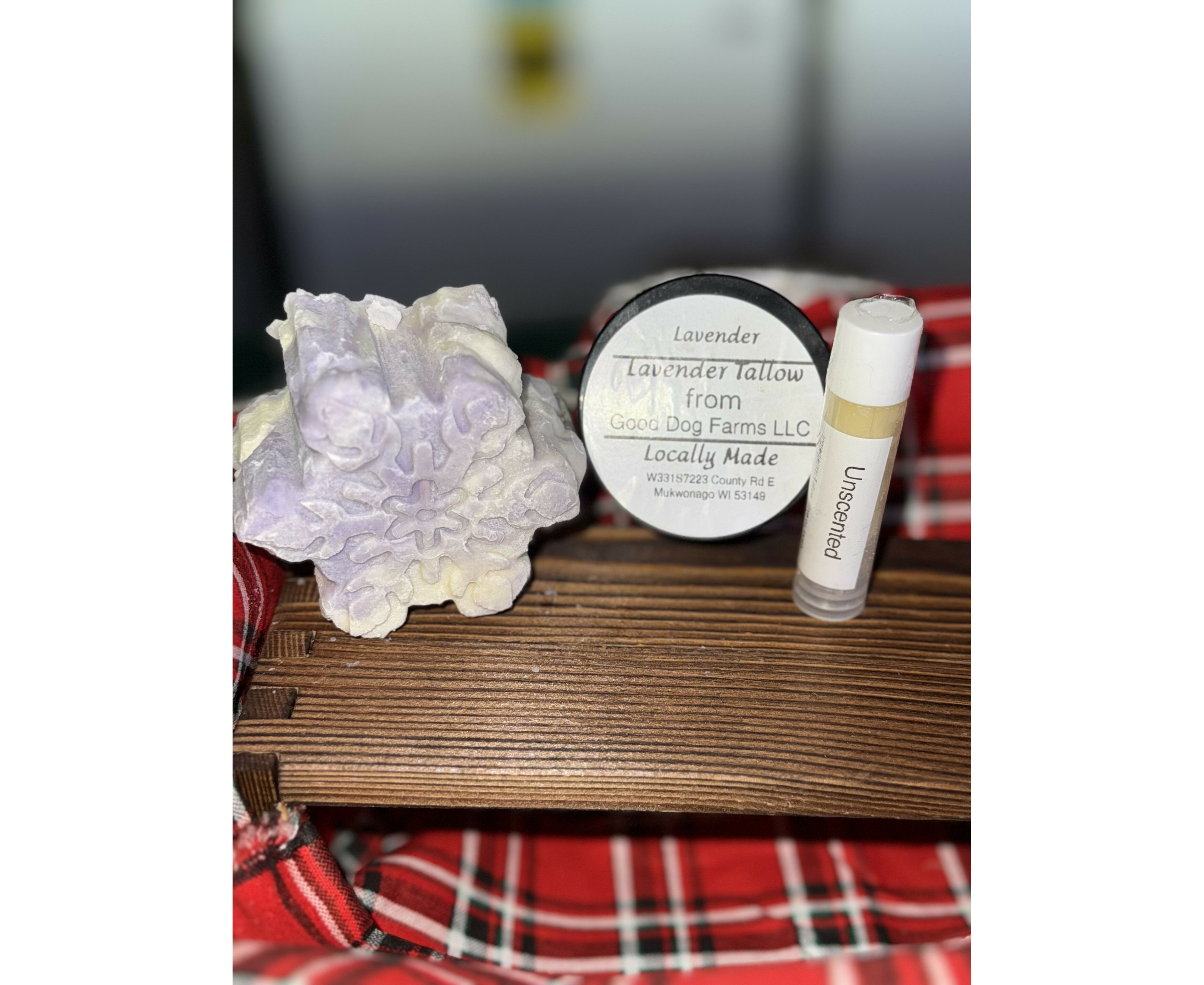 Looking for the perfect holiday gift for a teacher, friend, or even just to sample our tallow products this box is for you! It contains a sample of each of our tallow products. In this box you will get a small lotion, soap (in a fun shape as supplies last if you choose) and a chapstick.