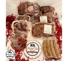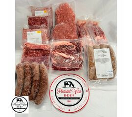 This Bundle Includes: 2 pkgs. Pork Bacon 2 pkgs. Breakfast Sausage 2 pkgs. Ground Beef 1 pkg. Chuck Eye Steaks (2 per pkg) 2 pkgs. Beef Patties 1/4# 2 pkgs. Beef Brats