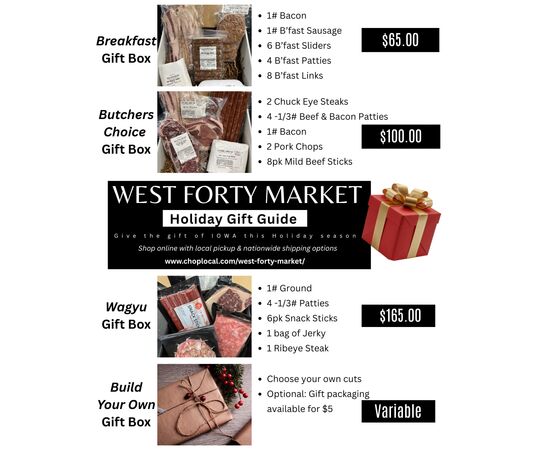 Orders from West Forty Market are available for pick-up at our Ankeny, Iowa and Greene, Iowa locations during our regular business hours.